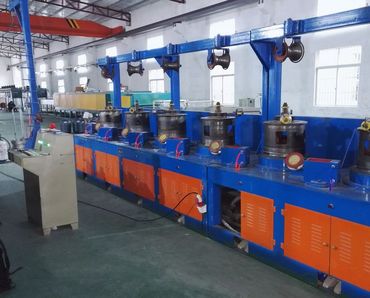 直進(jìn)拉絲機(jī)將粗口徑的盤條經(jīng)過多道次拉拔后,變成細(xì)口徑的金屬絲,拉絲機(jī)設(shè)備由放卷、多級模具拉伸、收卷組成;比如一個