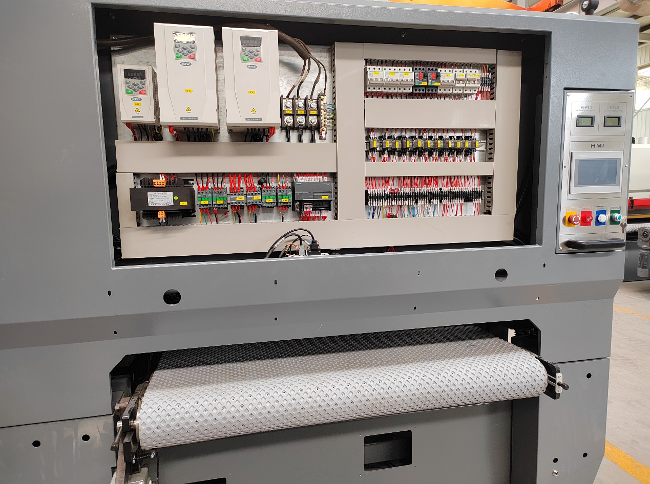 采用易能ENA100系列變頻器,控制砂帶旋轉(zhuǎn)速度和送料速度的自動(dòng)化砂光機(jī),可實(shí)現(xiàn)無(wú)級(jí)變速,降低人力需求、增進(jìn)產(chǎn)能。送料電機(jī)配有一個(gè)編碼器用于計(jì)算加工量及工件位置。砂架、砂頭的數(shù)量可根據(jù)實(shí)際需求增減,由PLC程序控制多臺(tái)變頻器驅(qū)動(dòng)砂帶電機(jī)運(yùn)行,通過(guò)無(wú)極調(diào)速功能,滿(mǎn)足各種材質(zhì)的加工需求。砂光機(jī)設(shè)備可根據(jù)加工量增加而啟動(dòng)氣閥,進(jìn)行自動(dòng)進(jìn)給補(bǔ)償,保證砂頭不會(huì)因磨輪的磨損而改變砂削效果,保證成品的規(guī)格統(tǒng)一。