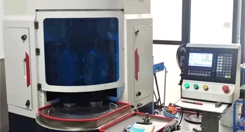 該雙軸端面磨床適用于數(shù)控刀片及五金零部件精密平面研磨,可應(yīng)對(duì)硬質(zhì)合金、金屬陶瓷等材質(zhì)。其結(jié)構(gòu)主要由一個(gè)圓形旋轉(zhuǎn)工作盤以及兩個(gè)立式升降磨頭(精磨和粗磨)組成,每個(gè)升降磨頭內(nèi)部為砂輪主軸。